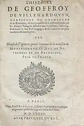Geoffrey of Villehardouin (c. 1150 – c. 1213[1]) was a French knight and historian who participated in and chronicled the Fourth Crusade. He is considered one of the most important historians of the time period,[2] best known for writing the eyewitness account De la Conquête de Constantinople (On the Conquest of Constantinople), about the battle for Constantinople between the Christians of the West and the Christians of the East on 13 April 1204. The Conquest is the earliest French historical prose narrative that has survived to modern times. Ηis full title was: "Geoffroi of Villehardouin, Marshal of Champagne and of Romania".