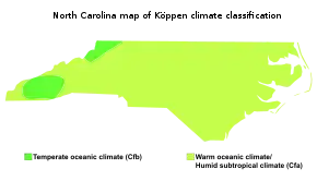 The climate of North Carolina is mild and equable. This is due in part to its geographical position: midway in the Northern Hemisphere. Also, the high Appalachian chain offers, to some extent, a shield from cold winter winds of the northwest. On the ocean side, in winter, is the moderating influence of the warm Gulf Stream, the current of which sweeps along near its shores.