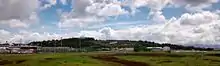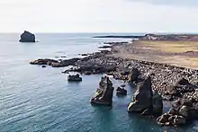 These shields are mostly circular in form, built up from pāhoehoe lavas and composed of a low-sloping lava cone surrounded by a lava apron;[1] the older shields are made from picrite, the younger, bigger ones from olivine-tholeiite. They were probably formed in long-lived eruptions (years to decades).[1] The best known edifices are Selvogsheiði [ˈsɛlˌvɔksˌheiːðɪ] (height 176 m, basal width 4.8 km, summit width 0.7 km, volume 0.64 km3), Þráinskjöldur [ˈθrauːɪnˌscœltʏr̥] (volume 5.2 km3), Heiðin há (volume 6 km3) and Sandfellshæð [ˈsantˌfɛlsˌhaiːθ] (4.5 km3).[10] Sandfellshæð is a very regularly constructed shield volcano and the largest in the southern part of Reykjanes Peninsula.[11] Another important shield volcano on Reykjanes Peninsula is Leitin, formed around 5,000 years ago.