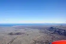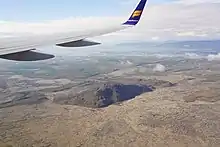 The topography of Reykjanes Peninsula was formed by glaciers and volcanism, basaltic lava fields covering a good part of the peninsula, in between volcanoes of subglacial as well as subaerial origin, namely tuyas, hyaloclastic ridges (tindars), shield volcanoes and crater rows.[1] Some volcanic systems are submarine, so that there is a pronounced continuation between the volcanism of Reykjanes Ridge, a part of the Mid-Atlantic Ridge, and the Reykjanes Peninsula.