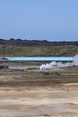 Since the end of the Pleistocene glaciation (15.000 – 11.000 years ago in the region),[1] Holocene volcanoes have contributed to the basaltic larva fields of the peninsula. The Reykjanes volcanic belt (previously also known as the Reykjanes Peninsula ridge,[12] or Reykjanes Peninsula volcanic zone[13]:17511), one of the present day volcanic zones of Iceland, is connected to the submarine Reykjanes Ridge and consists (depending on author) of 3 to 6 or even 7 volcanic systems, arranged en echelon, i.e. more or less side by side, and in an average 40° angle to the spreading direction NE–SW over the peninsula.[14] [15] Within the belt is a region of transition from the mainly extensional structure of the underwater Reykjanes Ridge of the Atlantic mid-oceanic ridge to the trans-tensional plate boundary in the Reykjanes Peninsula.[14] These volcanic systems are: Eldey volcanic system (mostly submarine), Reykjanes volcanic system, Svartsengi volcanic system (often thought to be a part of Reykjanes volcanic system), Krýsuvík volcanic system, Brennisteinsfjöll volcanic system, and Hengill volcanic system (which stretches up to the north and into the West volcanic zone).[16] Only the Hengill volcanic system, the most eastern system, has an additional central volcano and this volcano is complex as it is at the intersection with the West volcanic zone of Iceland and South Iceland seismic zone,[17][18] forming the Hengill triple junction.[19]:1128 It has some rhyolite and andesite components.[18] It is tectonically the current locus of accretion in the south of Iceland propagating southward at between 3.5–5 cm/year (1.4–2.0 in/year).[13]:17512