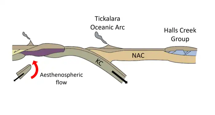 After the Hooper Orogeny, the downgoing slab, which had been deeply subducted into the asthenosphere, detached from the surface portion of the tectonic plate. The resulting change in isostasy temporarily buoyed the thinned-out Kimberley Craton section above the North Australian Craton, leading to the formation of the accretionary wedge of the Tickalara Arc, and setting the stage for the later suturing of the Kimberley Craton and North Australian Craton.[2]