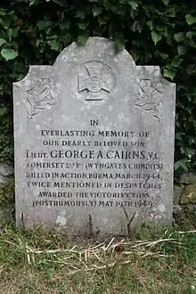 Cairns was buried at Taukkyan War Cemetery in Burma. His grave is located at Plot 6, Row A, Grave 4.[11] A stone memorial similar to a headstone commemorates Cairns at St Mary the Virgin Church, Brighstone, Isle of Wight.[12]