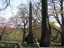 The tower of George Bird Grinnell's headstone in Woodlawn Cemetery