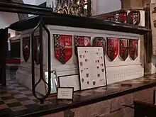 George Clifford died on 30 October 1605 at the duchy house of the Savoy in London. His body was embalmed and buried in the family vault at Skipton Castle in Craven, Yorkshire, his family seat, where a black marble altar tomb to his memory was erected by his daughter, Lady Anne Clifford.[1] Also, his chest tomb monument survives in Holy Trinity church, Skipton, adjacent to the castle. It is profusely decorated with heraldry, showing the arms of Clifford quartering Vipont (the feudal barons of Appleby, from whom the Cliffords inherited Appleby Castle and vast estates in Westmorland), impaling the arms of Russell as well as the wives of Clifford's paternal predecessors: Beauchamp, de Roos, Percy, Dacre, Berkeley, Neville, etc.
