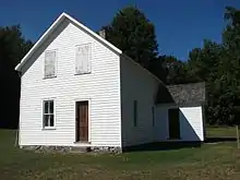 - Two-story 18 feet (5.5 m) by 20 feet (6.1 m) structure with wooden shingles and board-and-batten siding.