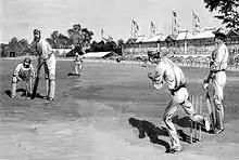 The first game passed off without incident, New South Wales winning by five wickets.[67] England fought back in the return match, which began on 7 February. In reply to the tourists' first innings total of 267, Billy Murdoch, the star of New South Wales, carried his bat for 82 out of 177 and had reached 10 in the follow-on when Coulthard gave him run out.[67] The dismissal caused an uproar in the crowd of 10,000, incited, it was alleged, by bookmakers and their cohorts in the pavilion, who told Murdoch to stay on the field.[68] It was not Coulthard's first controversial call; on the first day, he gave the caught Harris a second life, a "blatant error" according to one match reporter.[64]