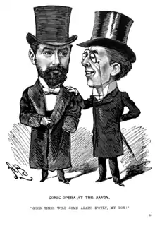 In 1873, Grossmith and his father began joint tours of humorous recitations and comic sketches at literary institutes and public halls, to church groups and to branches of the YMCA all over England and even in Scotland and Wales. Young Grossmith's sketches at this time included The Puddleton Penny Readings, Our Choral Society and In the Stalls. They toured almost constantly for the following three years, but they returned to see their families in London on weekends.[15] Around this time, he met and became firm friends with Fred Sullivan, and afterwards, he met Sullivan's brother Arthur.[16] Through Arthur Cecil, Sullivan, and some of their friends, Grossmith began to be invited to entertain at private "society" parties, which he continued to do throughout his career. Later, these parties would often occur late in the evening after Grossmith performed at the Savoy Theatre.[17] In 1876, he collaborated with Florence Marryat, the author and reciter, on Entre Nous. This piece consisted of a series of piano sketches, alternating with scenes and costumed recitations, including a two-person "satirical musical sketch", really a short comic opera, called Cups and Saucers, which they then toured.[15] Grossmith also took a number of engagements, including recitals at private homes.[11] In 1877, Lionel Brough introduced another popular Grossmith song, "The Muddle Puddle Junction Porter".[12] By then, Grossmith had become friendly with many in the music and theatre establishments, including Arthur Sullivan and impresario Richard D'Oyly Carte; and Grossmith had the opportunity to perform in Gilbert and Sullivan's Trial by Jury and other Sullivan works at charity benefits.[18]