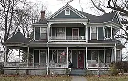 The Ward House is a 2½ story, frame structure executed in the Queen Anne style. The main block measures 39 by 36 feet (12 by 11 m) and the summer kitchen adds another 14 by 15 feet (4.3 by 4.6 m).[2] The primary decorative feature on the exterior is a wrap-around porch. It is highlighted by a corner turret capped with a finial, and it is enclosed with a balustrade. The asymmetrical facade has a second story porch above the main floor porch with a distinctive balustrade. The main block of the house is capped with a hip roof. The cross gables feature metal crests along the top. A barn on the property that housed the carriage and horses was replaced by a smaller garage at some point.[2]