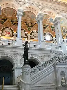 In Washington, DC, he designed the staircase in the Great Hall of the Library of Congress. Next to the Library of Congress he designed residences for embassies in the land on which the Folger Shakespeare Library now stands. "Back in the early 70s, when old Washington was expected to grow to the east from the face of the Capital, Grant row was built in elaborate style after designs by a German architect named Griebel, in the belief that embassies and legations would be attracted to Capital Hill and that the section would become the most attractive residential section of the city....Failing in the original plan of becoming a focal point of the elite of Washington society, these houses, nevertheless, held a place of their own in Washington realty...Many members of the Congress occupied these houses after their completion but for some reason the embassies did not spread in that direction." "The residents of Capitol Hill welcome this new structure in their neighborhood but they will not soon forget old Grant Row, a line of well built red brick houses set far back from the street on the site now occupied by the Folger Library."[2]
