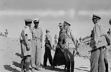 On the night of 3 September, the brigade was involved in a nighttime attack during which the commander of its 26th Battalion was mortally wounded.[21] With the battalion leaderless and disorganised, Clifton tried to restore order. He approached what he thought were friendly troops only to find himself in the hands of the Italian 185th Folgore Division. Debriefed personally by the commander of the Panzer Army Africa, Generalfeldmarschall Erwin Rommel, Clifton was taken away afterwards by truck but promptly jumped out to try and escape. Chased down by the guards, he was recaptured only to give them the slip again. He walked for five days to El Alamein before he was noticed by the crew of a German tank and captured. Taken before Rommel again, he was threatened with a firing squad if he was to escape again. He was flown to Italy the next day.[22]