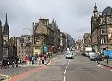 Further south on the street lie the National Library of Scotland and (opposite) the Edinburgh Central Library, the latter being one of the many free libraries constructed with money provided by the Scottish-born philanthropist Andrew Carnegie. Around the middle of the street, where the bridge crosses the historic Cowgate, are located a number of bars and restaurants and takeaways, as well as the ESL institute Wallace College and the Augustine United Church. The former Elim Pentecostal Church has been converted to a public house.[12]