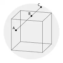 The second occurrence is in a cube. If one connects the centers A and B of any two cube adjacent faces and extends the connecting line segment again, such that the extended line intersects the circumscribed sphere at C, then B will divide AC according to the golden section.[3]