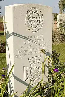 Moor died of Spanish influenza[5] at Mouvaux, France, on 3 November 1918. He is buried in the Y Farm Military Cemetery, Bois-Grenier, which is cared for by the Commonwealth War Graves Commission.[6] The inscription on his gravestone reads: VINCAM ET VINCAM.[6] A copy of his VC is displayed at the Royal Hampshire Regiment Museum in Winchester, England.