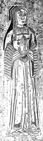 - Eleanor Dacres, second daughter of Henry Dacres, Merchant Taylor and Alderman of London,[39] whom he married sometime before 1522, and by whom he had six sons and five daughters. Eleanor's sister Anne Dacres was the wife of Sir John Pakington (died 1551), MP, of Hampton Lovett, Worcestershire, and her other sister Alice Dacres was the wife of Robert Cheseman (died 1547), MP for Middlesex. Henry Dacres' monumental brass exists in St Dunstan's Church in the West, City of London, showing two brass kneeling figures, male and female, with labels protruding from their mouths. Beneath them is the following inscription: "Here lyeth buryed the body of Henry Dacres, Cetezen and Marchant Taylor and sumtyme Alderman of London, and Elizabeth his wyffe, the whych Henry decessed the ? day of ? the yere of our Lord God ? and the said Elizabeth decessed the xxiii day of Apryll the yere of our Lord God Mdc and xxx."[40][nb 6]