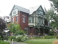 Scott's house features a mix of materials: the foundation is stone, the walls are brick, the roof is slate, and wooden elements are also prominent.[6] Two and a half stories tall, the house combines generic Victorian styling with Queen Anne influences.[5]: 4 Among its prominent components are the large gables formed by the rooflines, Eastlake-style details on the porch, and a turret on one corner. Half-timbering with stucco covers many of the front walls above and around the porch, which itself includes details such as a pediment and frieze, while the turret's exterior comprises numerous lintels and lugsills, and its roof is an eight-sided pyramid.[2]