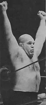 Looking to supplement his income, he got into the world of Detroit-area professional wrestling, but in order to protect his privacy, he wrestled using a mask and the name "the Student".[4] Gary Hart served as the Student's manager and had to explain to the announcers why his client could not apply any legitimate holds or maneuvers instead relying on only his undisciplined brute strength.[10] Myers was soon scouted by World Wide Wrestling Federation (WWWF) champion Bruno Sammartino and began working in Pittsburgh in 1967 on the popular Studio Wrestling TV show broadcast on WIIC-TV (later WPXI-TV) Channel 11. Sammartino had liked the character Myers developed of a wild man with incredible strength. However, he had him drop the mask, as well as the title of the Student. Looking to hide his real name, Myers opted for the alias "George Steele". According to Michigan High School Hall of Fame coach George Steele of Warren, he and Myers were coaching against each other in a high school JV match-up while both were early into their careers. At halftime, Myers approached Steele and told him about his venture into wrestling and that he was looking for a name. Myers allegedly asked Steele if he could use his name, that he liked it a lot and the future Hall of Fame coach told him no problem. Steele states in an interview available on YouTube that he was in Pittsburgh when he was looking for a stage name. Local wrestler "Jumpin'" John DeFazio suggested Jim Steele since he was in the "Steel City". He did not like the first name Jim and he suggested George which is what he eventually went with.[11]