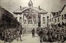 Leonard was also one of the founders of Wall Street, being a founder of the New York Stock Exchange through the Buttonwood Agreement, and was a brother of Anthony Lispenard Bleecker.[10][11][5] Their uncle Col. Leonard Lispenard married with Benjamin Franklin's family (Bache), the Roosevelts and Van Cortlandts. Bleecker entered into a partnership in 1791 with merchant John Pintard, a founder of the New York Historical Society, the first museum in the city, and had office at the Merchants’ Coffee House in Manhattan, which was also the offices of the Bank of New York, founded by Hamilton, and the New York Chamber of Commerce.[12][13] His granddaughter, Fannie Amelia Bleecker, married Frank Willey Yale (b. 1854), a relative of Charles G. Yale and Yale Gracey, members of the Yale family of Yale University.[14]