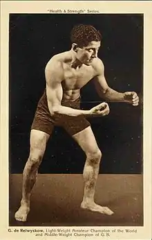 Born in Kensington in 1887, the son of immigrants from the Russian Empire, de Relwyskow took up wrestling as a means of keeping fit while a student in London training as an artist and designer. By 1907 he had won thirty-five open competitions in Great Britain and won the English amateur championships at lightweight and middleweight in 1907 and 1908. Because of his success he selected to represent Great Britain in the 1908 Olympics held in London.[2]