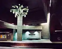 The station, designed by architect Pierre-W. Major, is a normal side platform station, and has one access. The huge underground volume of the station mezzanine is lighted by a single, round skylight, and is decorated with a sculpture, Un arbre dans le parc, by Michel Dernuet, is situated on the Côte-Vertu platform; it is a large concrete pillar with illuminated branches, representing a tree. The wall facing the easternmost stairs for the Montmorency platform is faced with blue ceramic symbolizing a fresh spring in the woods.