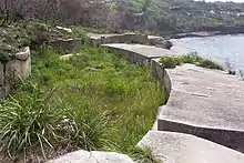 On 10 March 1801 Governor Philip Gidley King informed the Secretary of State for Colonies that a battery was "in forwardness opposite the entrance to the Harbour, which will completely prevent attack from without". Despite that confidence, the job took another two years to finish. With only picks, crowbars, wedges and sledgehammers, a gun pit was cut out of solid sandstone, leaving a curved parapet 24-metre (80 ft) long on the cliff edge about 15 metres (50 ft) above sea level. There were two embrasures or gun openings, but guns could also be fired over the parapet. The guns – four twelve-pounders and two six-pounders – were landed at Obelisk Beach (then known as Georges Beach) and hauled up through the bush. Also in the gun pit was built a magazine for powder and shot, with stone walls three feet thick.[5] The Sydney Gazette reported on 23 October 1803 that "The new battery is compleated and the artificers and labourers recalled ... the battery mounts six guns, two long twelves [12 pounders] on the right, two of the same size on the left and two short sixes in the centre. The first of these command the bay inwardly, those on the left command the entrance of the harbour between the heads and those in the centre point across the channel."[6]