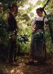 Images of Laugée's works began to appear in various publications, including Famous Paintings of the World (1894),[9] which was an early type of introductory art history text. The authors selected Laugée's painting Bergere et Mouton (Shepherdess and Lamb, see illustration in gallery below), a "charming picture" of a shepherdess feeding her favorite lamb. "It is a simple story the artist has chosen to tell; but he has set it in a scene of tender and idyllic beauty, thoroughly appropriate to the gentle theme of affection he has selected for the central thought." The theme of the shepherdess is one to which Laugée returned many times. Typical is the Bergère au tricot (Shepherdess Knitting), shown to the right, which like Au printemps de la vie shows Pre-Raphaelite as well as Impressionist influences. Other paintings on the shepherdess theme can be seen in the Gallery below.