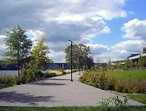 Georgetown Waterfront Park is a national park completed in Washington, D.C. in the fall of 2011. Part of the Georgetown Historic District, the park stretches along the banks of the Potomac River from 31st Street, NW to the Key Bridge. The result of many years of advocacy and fundraising, the site features several notable design elements. Now complete, the park links 225 miles (362 km) of parkland along the Potomac River stretching from Cumberland, Maryland to Mount Vernon, Virginia. The park was designed to passively complement the natural curve of the river.