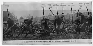 Describing the most spectacular play he ever saw, coach Alexander cites one from the 1925 game against Vanderbilt. Doug Wycoff was hurt, and his substitute Dick Wright was sent in with only minutes to go in the game. On a muddy field, Wright ran off tackle and dodged Vanderbilt's safety Gil Reese, "usually a sure tackler," to get the touchdown that gave Tech a 7–0 victory.[30] The yearbook remarked, Wright "should have run for governor of Georgia right after he ran 56 yards against Vandy."