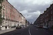 ![]() A view down the length of the Georgian mile in 1993. The terminating vista is Holles Street Hospital. The gas cylinder behind it was demolished in the mid-'90s | |