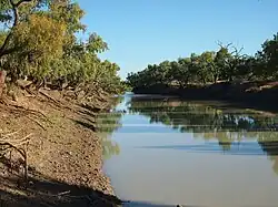 With its headwaters rising in the Barkly Tableland, north of Camooweal in Queensland, and in the extreme east of the Northern Territory beyond Tennant Creek and to the south draining the northern slopes of the Macdonnell Ranges, the Georgina is formed from several smaller streams over a wide area of north-western Queensland and the eastern Northern Territory. From source to mouth, the Georgina is joined by more than 35 tributaries including the Buckley, Templeton, Burke, Hamilton, Herbert, Ranken, and Sandover rivers; and flows through 26 billabongs.[4][5] As the Georgina flows south into the Channel Country, it reaches a confluence with Eyre Creek that, in times of peak flow, empties into the Warburton River and ultimately into Lake Eyre.[7]