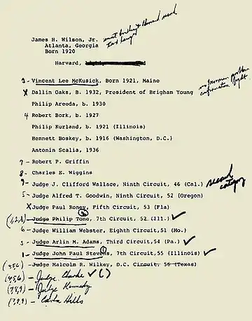 After Douglas announced his retirement on November 12, 1975, Ford asked attorney general Edward Levi to draw up a list of potential candidates. Ford was under pressure from Democrats in Congress to replace Douglas with another liberal, but at the same time, he was under similar pressure from Republicans to name a conservative.[1] Ford handed Levi the task of narrowing down the list of candidates to a manageable number, and Levi then gave Ford a list of eighteen candidates, grouped into four categories based on Levi’s impressions of them.[5] Ford annotated the list and ranked the contenders,[1] narrowing the list to “five or six names,” Ford later wrote. The list included United States Solicitor General Robert Bork, United States Court of Appeals for the Seventh Circuit judge John Paul Stevens, United States Court of Appeals for the Sixth Circuit judge Cornelia Groefsema Kennedy, United States Secretary of Housing and Urban Development Carla Anderson Hills, and United States Court of Appeals for the Third Circuit judge Arlin Adams.[6]