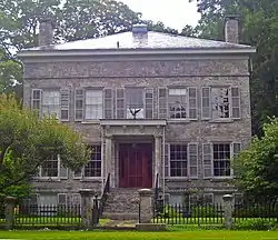The house is a two-and-a-half-story five-bay stone building on a raised basement with a shallow hipped roof with small cupola and identical chimneys on the north and south. It is sided in a locally quarried granite with an unusual natural marbleized appearance in a smooth-faced ashlar pattern with quoins on the front (reverting to random ashlar on the rear and sides). The roofline has a plain frieze, simple cornice and is set off by a stringcourse.[1]