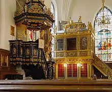 The so-called "king's gallery" crowned by the monogram of King Charles XI was designed by Nicodemus Tessin the Elder. The green and golden structure, at the time resting on pillars seemingly suspended over the floor, was reached by a magnificently carved flight of stairs used by generations of royal families, often of German descent, attending the sermons. The ceiling displays a painting by David Klöcker Ehrenstrahl, born in Hamburg and a member of the German parish. The lower part of the gallery was later glazed and today contains the sacristy. The painted windows are all from the turn of the century 1900. The southern windows, arguably, retell the benefits of living a devoted life. By the entrance is a commemorative plate reminding of the restaurateur Peter Hinrich Fuhrman (-1773), one of the church's most important donors.[2]