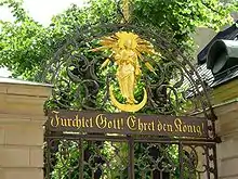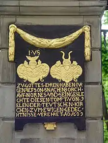 Over the northern gate facing Tyska Brinken is a gilded images of the patron saint and the exhortation Fürchtet Gott! Ehret den König! — "Fear God! Honour the King!". Flanking the eastern gate facing Svartmangatan are two tables carrying gilded inscriptions. The southern sandstone portal is flanked by statues of Jesus and Moses, in the context symbolizing the New and the Old Testaments, accompanied by Love, Hope, and Faith. The statues were cut by Jost Henne from Westphalia in the 1640s; he later became the alderman of the city's masons guild.[2]