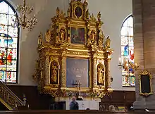 The interior is Baroque in style, the large windows of which make it overflowed by light, highlighting the white vaults and their many angels heads. The wine cellars of the original guild building are still found under the current marble floor. In the atrium is a window featuring St. Gertrude herself holding a chalice in one hand and a model of the church in the other. The ten metres tall altar was created by Markus Hebel, a Baroque master from Neumünster, Schleswig-Holstein.[2]