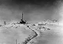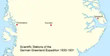 In 1929, as a preliminary expedition (German: Vorexpedition), Wegener went to Greenland to explore a suitable place to reach the Greenland Ice Sheet.[1] The main expedition would begin the following year with the goal to establish three Arctic stations on the same parallel. The central station was named Eismitte and was located at 71°11′N 39°56′W / 71.183°N 39.933°W near the center of the ice sheet. In the end this venture would claim Wegener's life during a return trip from the Eismitte station together with expedition member Rasmus Villumsen.[2]