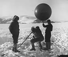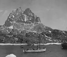 The first phase was an exploratory trip in 1929 to prepare the ground for the actual expedition which would take place the following year. Finances came from the Notgemeinschaft der Deutschen Wissenschaft. Wegener was accompanied by Johannes Georgi, Fritz Loewe and Ernst Sorge. They sailed on the ship Gertrud Rask to the western shore of Greenland. After arrival Wegener recruited, among others, Greenlandic Inuit Tobias Gabrielsen, with whom he was acquainted from the Danmark Expedition. The goal of this minor expedition was to find a suitable location to reach the Greenland ice sheet. It should be far enough to the south for the landing to be feasible as early as possible in the spring season, but also not too far from the northern latitudes, so that the temperature of the glaciers would be low enough.[3] The preliminary expedition also sought a good place to build the Western base station, as well as to assess the equipment and materiel that would be needed for the expedition; especially the means of transport. Wegener decided to bring dogsledges and ponies as well as aerosledges. He also used the occasion to carry out preliminary scientific research, including ice-drilling in order to gain knowledge about the melting and accumulation of the ice, as well as a seismic method to measure the thickness of the Greenland ice sheet.[4]