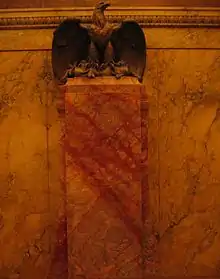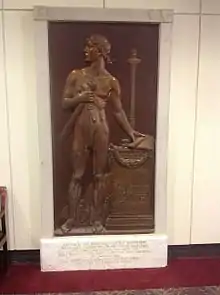 The Maryland State Bar Association dedicated another bronze memorial tablet, over 6 feet in height, to these six Baltimore attorneys, plus one other Maryland lawyer, who died in the war, in the main entrance hall at the Maryland Court of Appeals in Annapolis on January 11, 1921.[34] It was designed and executed by the Baltimore sculptor Ephraim Keyser and "represents the lawyer, turning in answer to his country's call, from his life work in his chosen profession, to serve its need on the field of battle."[35] The pedestal altar reads in part, "In grateful memory of the Lawyers of Maryland who lost their lives in the Great War while serving in the armed forces of their country. 1917–1918, O fortunata mors quae naturae debita pro patria est potissimum reddita. (O fortunate the death, the debt to nature owed by all, Paid by them in advance for their country's cause. Horace)