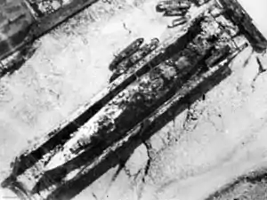 After arriving in Brest, Gneisenau was the subject of repeated British air raids. The first attack took place on the night of 30–31 March, and a second occurred on 4–5 April. During this second raid, a 227 kg (500 lb) armor-piercing (AP) bomb narrowly missed the ship. As a result of the attacks, the ship was moved out of the dry dock and moved to the harbor.[30] On 6 April, Gneisenau was attacked by British torpedo bombers, which managed to score a single hit.[31] The Bristol Beaufort that struck the ship was piloted by Flying Officer Kenneth Campbell, who was killed in the attack, for which he was awarded the Victoria Cross.[32] The torpedo struck Gneisenau in the vicinity of the rear main battery turret. Some 3,050 t (3,000 long tons) of water flooded the ship and caused a 2 degree list to starboard. The flooding also disabled several components of the ship's propulsion system. The explosion caused significant destruction to the side plating as well as the starboard and centerline propeller shafts. The concussive shock also caused widespread damage to the ship's electronic components. A salvage tug came alongside to assist in the pumping effort. Following the attack, Gneisenau returned to the drydock for repairs.[33]