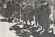 SS-soldiers and policemen posing among the bodies of refugees hunted down in forests