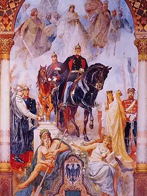 In The proclamation of the Reich (1871), part of an elaborate imperial iconographical program centred on the old Kaiserpfalz (Imperial Palace) in Goslar, Queen Luise, mother of the new emperor Wilhelm I was presented as Germania.[29]