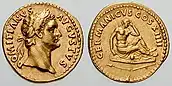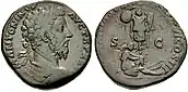 The figure of Germania appeared in Roman times, usually on coins, at first as a captive Amazon subdued by the Romans.[4] Sometimes, however, she appeared in a more dignified form as manifestation of a more integrative imperial ideology. For example, she was depicted with the attributes of Minerva on a coin in the reign of Hadrian.[5]
