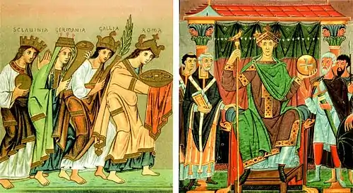 In another scene (Pericopes of Henry II, Bayrische Staatsbibliothek, CIm 4452, Fol. 2r) showing the 1014 coronation of Emperor Henry II and his empress, Kunigunde, she appeared as one of three provinces (together with Roma and Gallia). This represents Henry's idea of the Empire.[14]