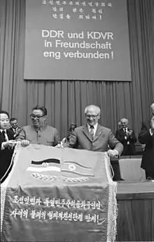 East Germany sought connections for trade, educational exchange and manifestations as a communist power with the Asian country. After the former USSR and the People's Republic of China, East Germany was the third biggest provider of money to North Korea to fight capitalism. This was done in the communist way of thinking it was clear to help loyal friends in any ways which can be imagined. Kim Il Sung also enjoyed a close personal relationship with East German First Secretary Erich Honecker. Honecker visited Pyongyang in 1977, while Kim reciprocated by visiting East Berlin in 1980.[4]