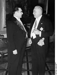 In the interwar period, German political and cultural influence became less relevant, as France became the primary influence on Kingdom of Yugoslavia, and French culture was favored by Serb elites.[10] However, under Stojadinović's reign, Yugoslavia became closer to Nazi Germany and moved away from its traditional allies, France and Great Britain.[11] In the later years, Yugoslavia joined the Tripaltite Pact. A total of 62 PhD theses were defended by Serbian intellectuals in the German language between the two world wars, of which 31 were in the domain of economics. A number of students of the University of Belgrade held German scholarships in the 1930s. Between 1937 and 1940, around 50 Yugoslav citizens studied in Germany, second only to France in the number of foreign students. A number of professors obtained their postgraduate degrees in Germany as well.[12]