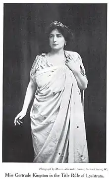 In 1910 she became the lessee and actor-manager of the Little Theatre in the Adelphi in London. Her opening season was inspired by the Royal Court Theatre's introduction of serious and classical drama to a commercial audience, and therefore she opened with Aristophanes' Lysistrata, in a version adapted and modernised by Lawrence Housman, in which she played the title role.[3] In 1911 Lillah McCarthy took over the lease of the Little Theatre, and Kingston returned to that theatre under McCarthy's management to play Madame Arcadina in The Seagull. Also in 1912 Kingston played Lady Cecily Waynflete in Captain Brassbound's Conversion. Then in 1913 George Bernard Shaw wrote the title role in his play Great Catherine for her.[2][7]