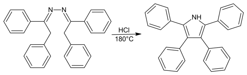 There are, however, a few problems with some syntheses. The Piloty-Robinson reaction competes with the formation of pyrazoline when the reactant is an aliphatic azine derived from a ketone. Also, under high temperatures and highly acidic solutions, azines derived from aldehydes are not stable. This prevents the formation of 2,5-disubstituted pyrroles (where R=H) using this method.[12]