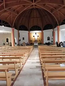 It is made up of the Presbytery, located in the apse, with a step higher than the hall, the Ambon and the sacramental area, with a wooden dome (in glued laminated timber) above it; the floor here is realized with polychrome marbles and so believers can differentiate the meaning of the different liturgical functions;[2] a central nave, corresponding with the hall, and with about 600 seats, and two aisles for the coming in and out of people, and for the processional route during the functions; the parvis which permits the outdoor celebrations with great participation of believers, thanks to its position on the top of the staircases.[2]