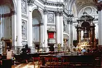 The High Altar stands at the top of five steps under an architectural canopy supported by columns, underneath the cupola. The altar beneath is in a rococo style with coloured marbles and carved shells, heads of angels and reliefs of roses, ears of corn and grapes.[26]
