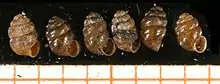 Six shells of Vertigo geyeri, scale bar in mm